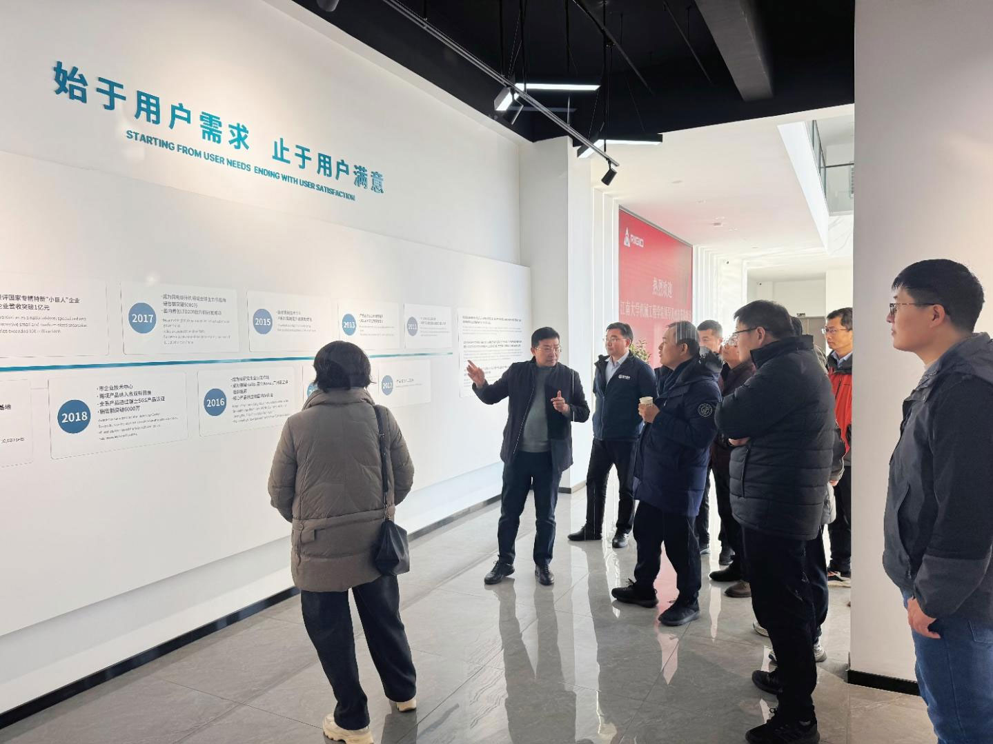 On January 16, 2025, Gao Xuemei (Secretary of the Party Committee of the School of Mechanical Engineering of Jiangnan University), Zhao Junhua(Dean), Qian Shanhua(Vice President), Wang Liqiang(former vice president and member of the Party Committee of the school), and Yang Zhaohui(president of the Wuxi Machinery Alumni Association), and a group of about 20 people came to visit Rigid, the 95th Qian Haijun alumni enterprise. Rigid company leader Chen Xuesong and technology center alumni Fu Yongsheng accompanied the visit.